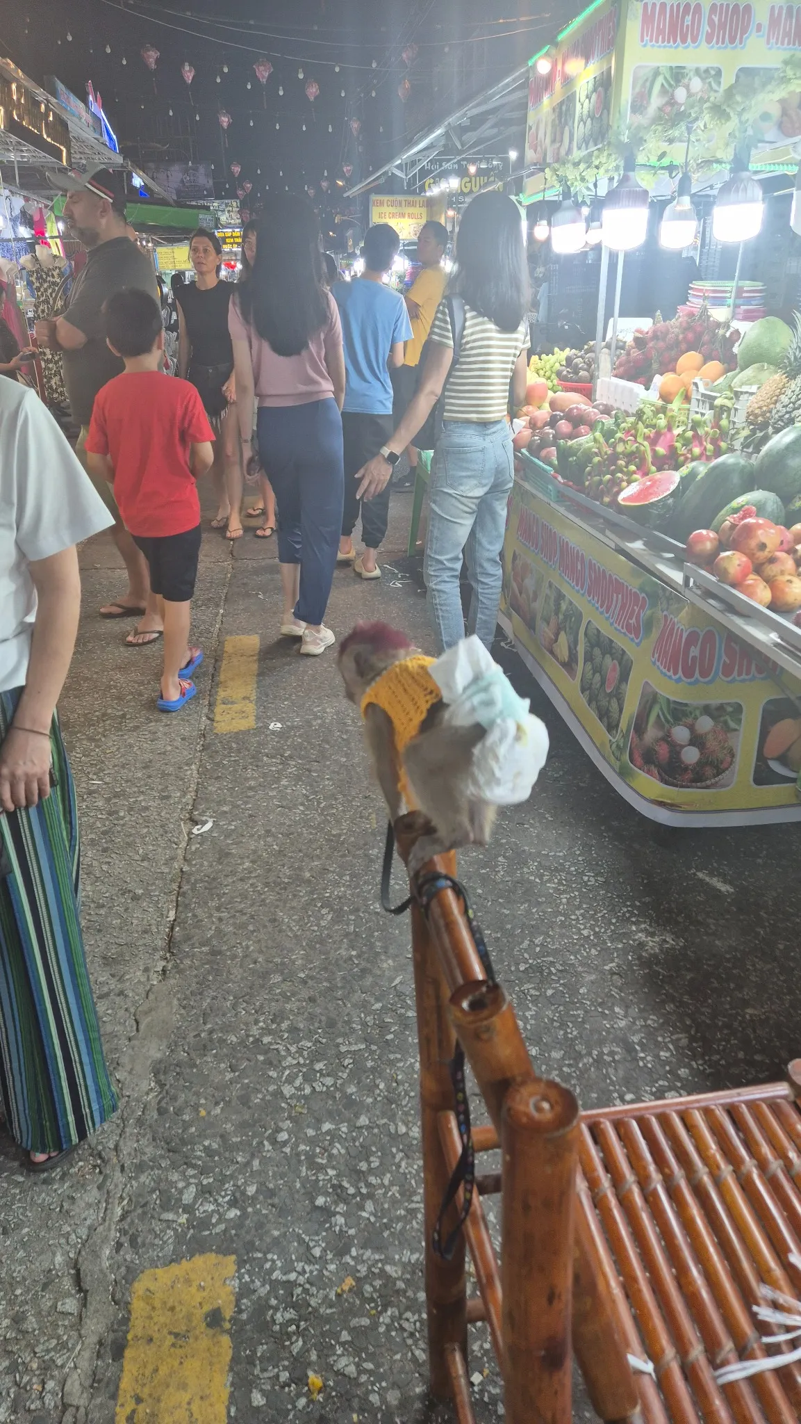 시장 구경 중 가장 눈에 띄었던 장면 중 하나는, 과일가게 앞 의자 위에 앉아 있던 작은 원숭이였습니다.