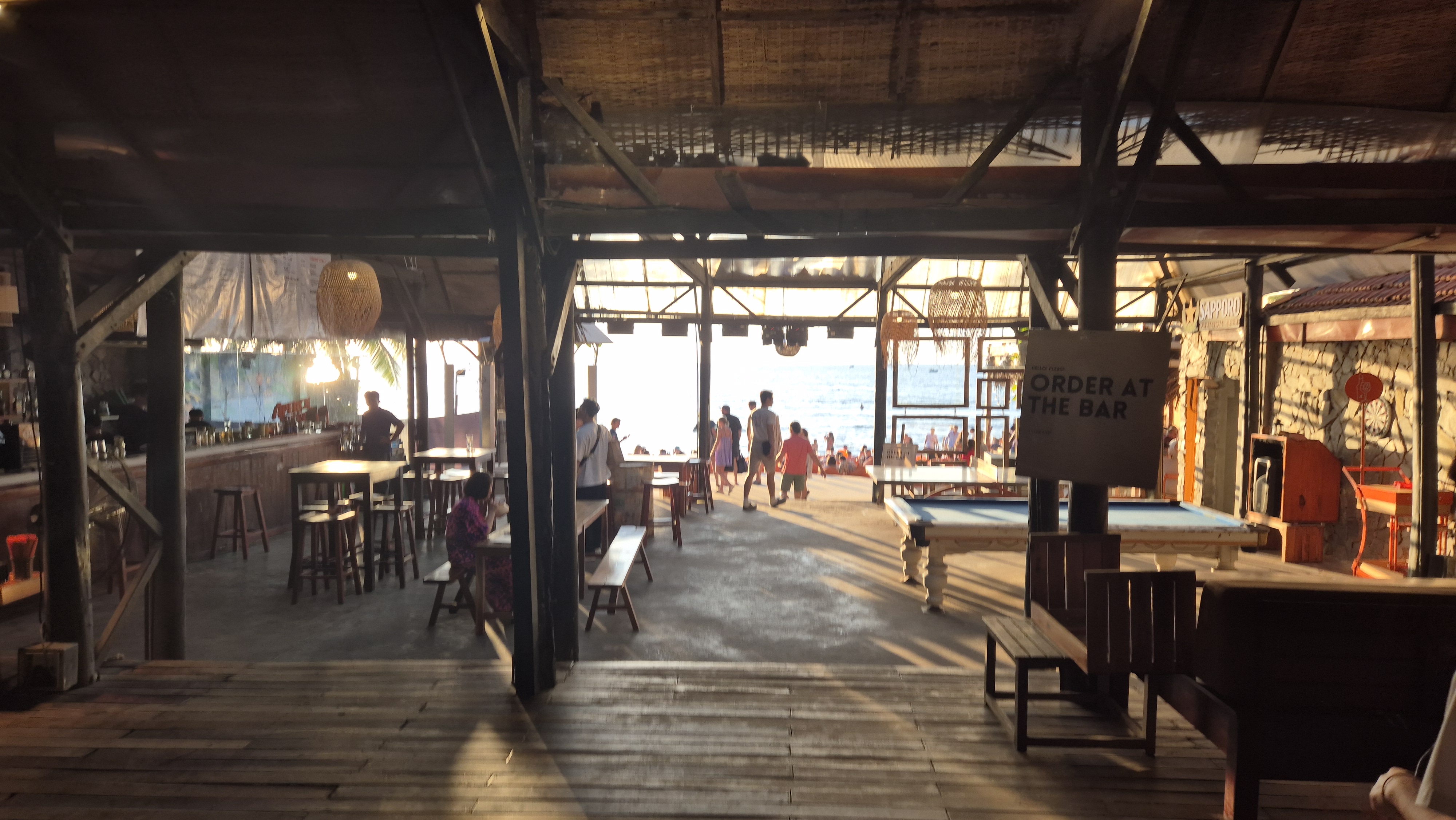 실내는 대나무, 나무, 통유리 등 자연 친화적 인테리어로 구성되어 있으며, 해변과 실내가 경계 없이 이어져 있는 오픈형 구조입니다. 바 안쪽에는 당구대, 바 테이블이 있고, 바깥쪽 해변에는 넓은 빈백 존이 모래 위에 펼쳐져 있어 발을 모래에 담근 채 노을을 바라볼 수 있는 구조입니다.